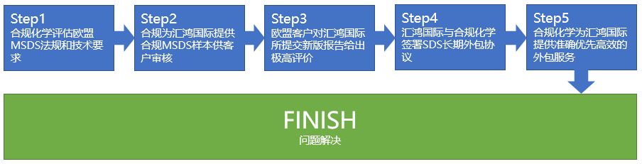 合规化学技术团队认真评估了汇鸿国际所面临的问题,为其提出了针对性的解决方案——MSDS外包服务,帮助汇鸿国际便捷有效的解决了出口欧盟MSDS合规难题,具体过程如下: